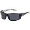 Super seje glansfulde solbriller med flotte metal detaljer både hvor stængerne starter og slutter. Solbrillerne har lækre sølv logoer på siden og et sejt Locs tryk med de seje hvide locs logoer på den sorte baggrund, der dækker hele stangens ydreside.